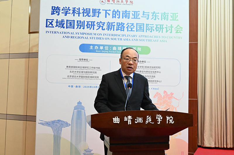 曲靖师范学院校长全洪涛致欢迎辞,向与会领导、嘉宾、国内外专家学者表示热烈欢迎,并介绍了学校基本情况和区域国别学建设情况。他说,学校始终将国际化、开放式办学作为重要发展战略,立足西南边陲服务国家战略需求,深化与“一带一路”沿线国家及高校的交流合作,于2025年申报“区域国别学”本科专业并获教育部公示,致力于培养服务“面向南亚东南亚辐射中心”战略的高素质应用型人才。他表示,学校将全力做好专业建设,提升服务能力,营造开放包容的学术氛围,愿以此次会议为纽带,携手推动南亚与东南亚研究启新程、迈新步,为文明对话贡献学术力量。
